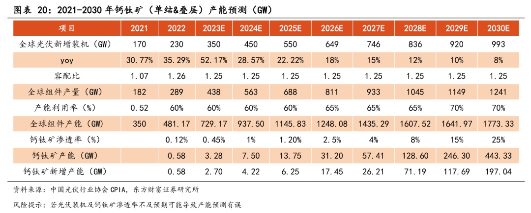 3)假設(shè)2022-2030年鈣鈦礦滲透率逐步由0.12%提升至25%;