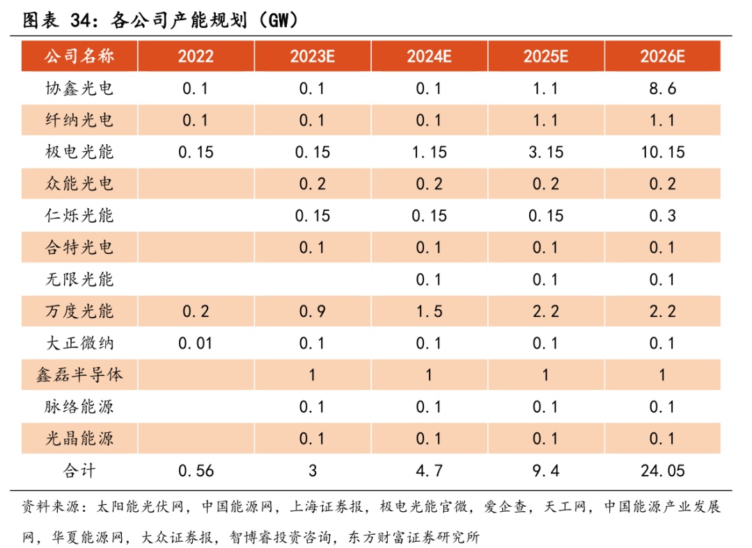 上下游產(chǎn)研聯(lián)動,產(chǎn)業(yè)化雛形已現(xiàn)。隨著國內(nèi)鈣鈦礦電池技術(shù)突飛猛進,技術(shù)產(chǎn)業(yè)化有提速趨勢,以協(xié)鑫光電、纖納光電、極電光能等一大批優(yōu)秀企業(yè)先后落地鈣鈦礦百兆瓦中試線,并取得優(yōu)秀的效率表現(xiàn),目前頭部各家GW級產(chǎn)線均已規(guī)劃建設(shè),預(yù)計2024年有望落地。同時,傳統(tǒng)晶硅企業(yè)依托在晶硅電池上的技術(shù)積累,主攻疊層方向,但多數(shù)仍處在實驗室階段。
