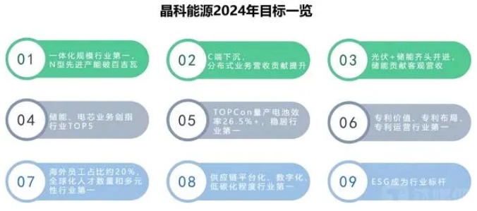 1月2日,光伏電池、組件龍頭晶科能源(688223.SH)官微發(fā)文披露了自身2024年的“小目標”。其中,第一條就是“一體化規(guī)模行業(yè)第一,N型先進產(chǎn)能突破100GW”。在業(yè)務(wù)層面,相關(guān)目標還有“分布式業(yè)務(wù)營收貢獻提升”“儲能貢獻可觀營收”“儲能、電芯業(yè)務(wù)劍指行業(yè)TOP5”等;在技術(shù)研發(fā)方面,主要目標有“TOPCon量產(chǎn)電池效率26.5%+,穩(wěn)居行業(yè)第一”“專利價值、專利布局、專利運營行業(yè)第一”;此外還有涉及全球化、供應(yīng)鏈智能綠色升級、ESG等相關(guān)領(lǐng)域的目標。