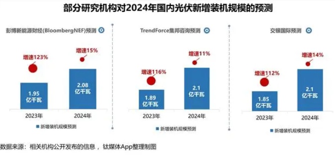 產(chǎn)能、技術(shù)之外,市場需求問題也是繞不開的話題,鈦媒體APP在此前的光伏產(chǎn)業(yè)展望中曾提及,多家機構(gòu)均預(yù)測2024年我國光伏需求增速將大幅放緩,彭博新能源財經(jīng)、集邦咨詢、交銀國際的2024年新增裝機增速預(yù)測均未超過15%(2023年增速超過100%);而從全球來看,對光伏裝機增速的預(yù)測也從2023年的超過60%降為了2024年的普遍低于30%。