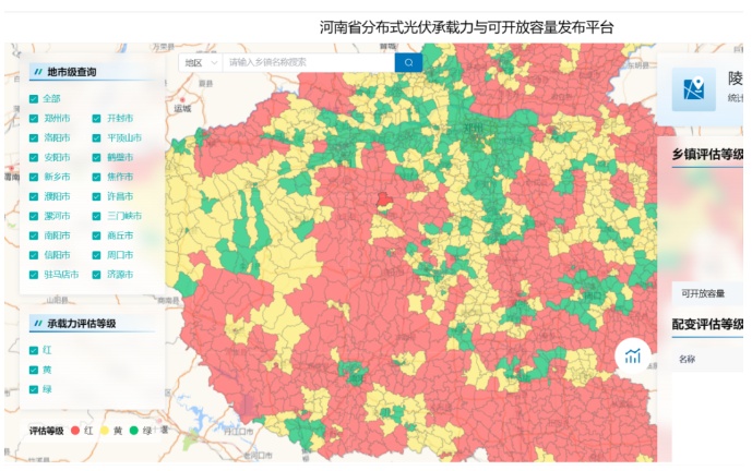 其中,河南明確分布式光伏開(kāi)發(fā)紅、黃、綠區(qū)域,按季度向社會(huì)公布,并適時(shí)縮短測(cè)算公布周期;優(yōu)先支持綠色區(qū)域內(nèi)的分布式光伏項(xiàng)目,黃色、紅色區(qū)域內(nèi)的分布式光伏項(xiàng)目,待落實(shí)消納條件后,再行開(kāi)發(fā)建設(shè)。根據(jù)河南省能源大數(shù)據(jù)中心公布的情況,河南不同區(qū)域的承載力情況如下圖所示,河南整體上已經(jīng)處于紅黃狀態(tài),綠色區(qū)域較小。