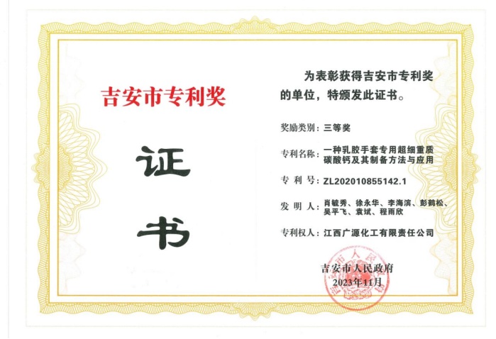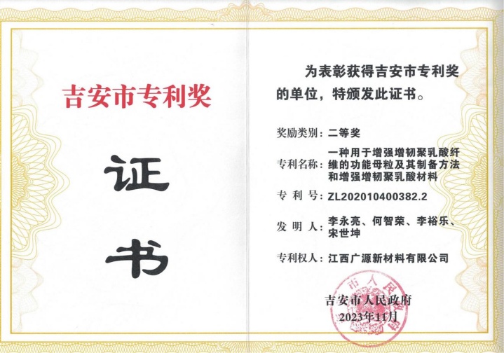 中國粉體網(wǎng)訊 近日,從吉安市委市政府、吉安市場監(jiān)督管理局傳來好消息,廣源集團(tuán)發(fā)明專利“一種用于增強(qiáng)增韌聚乳酸纖維的功能母粒及其制備方法和增強(qiáng)增韌聚乳酸材料”榮獲“2023年度吉安市專利二等獎”;發(fā)明專利“一種乳膠手套專用超細(xì)重質(zhì)碳酸鈣及其制備方法與應(yīng)用”榮獲“2023年度吉安市專利三等獎”。