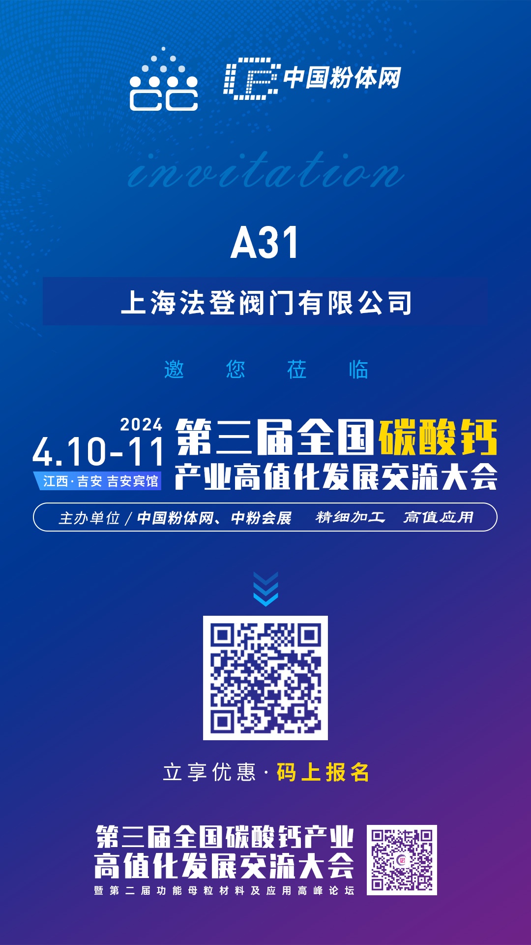由中國粉體網(wǎng)主辦的“2024第三屆全國碳酸鈣交流會(huì)”將于2024年4月10-11號(hào)在江西吉安舉辦,上海法登閥門有限公司邀您一同參加。