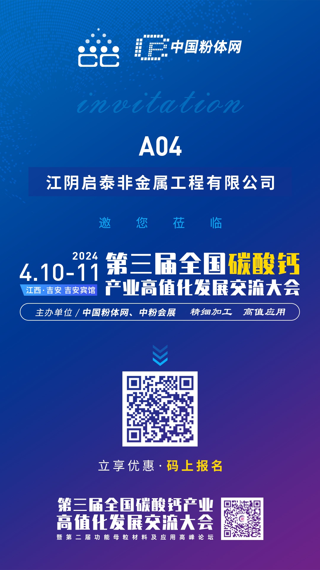 由中國粉體網(wǎng)主辦的“2024第三屆全國碳酸鈣交流會”將于2024年4月10-11號在江西吉安舉辦,江陰市啟泰非金屬工程有限公司邀您一同參加。