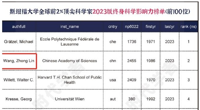 這份榜單,是從全球960多萬(wàn)名科學(xué)家中,收錄排名前2%,也就是約20萬(wàn)名優(yōu)秀科學(xué)家。又在這20萬(wàn)名優(yōu)秀科學(xué)家里,排出了終身科學(xué)影響力,在世界前一百位的頂級(jí)科學(xué)家中,王中林排在第二。