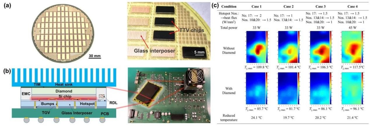 成果顯示,合作團(tuán)隊(duì)克服了微凸點(diǎn)保護(hù)、晶圓翹曲等行業(yè)難題,成功將多晶金剛石襯底集成到2.5D玻璃轉(zhuǎn)接板(Interposer)封裝芯片的背面,并采用熱測(cè)試芯片(TTV)研究其散熱特性。利用金剛石的超高熱導(dǎo)率,在芯片熱點(diǎn)功率密度為~2 W/mm2時(shí),集成金剛石散熱襯底使得芯片最高結(jié)溫降低高達(dá)24.1 ℃,芯片封裝熱阻降低28.5%。先進(jìn)封裝芯片-金剛石具有極為優(yōu)越的散熱性能,基于金剛石襯底的先進(jìn)封裝集成芯片散熱具有重大的應(yīng)用前景。