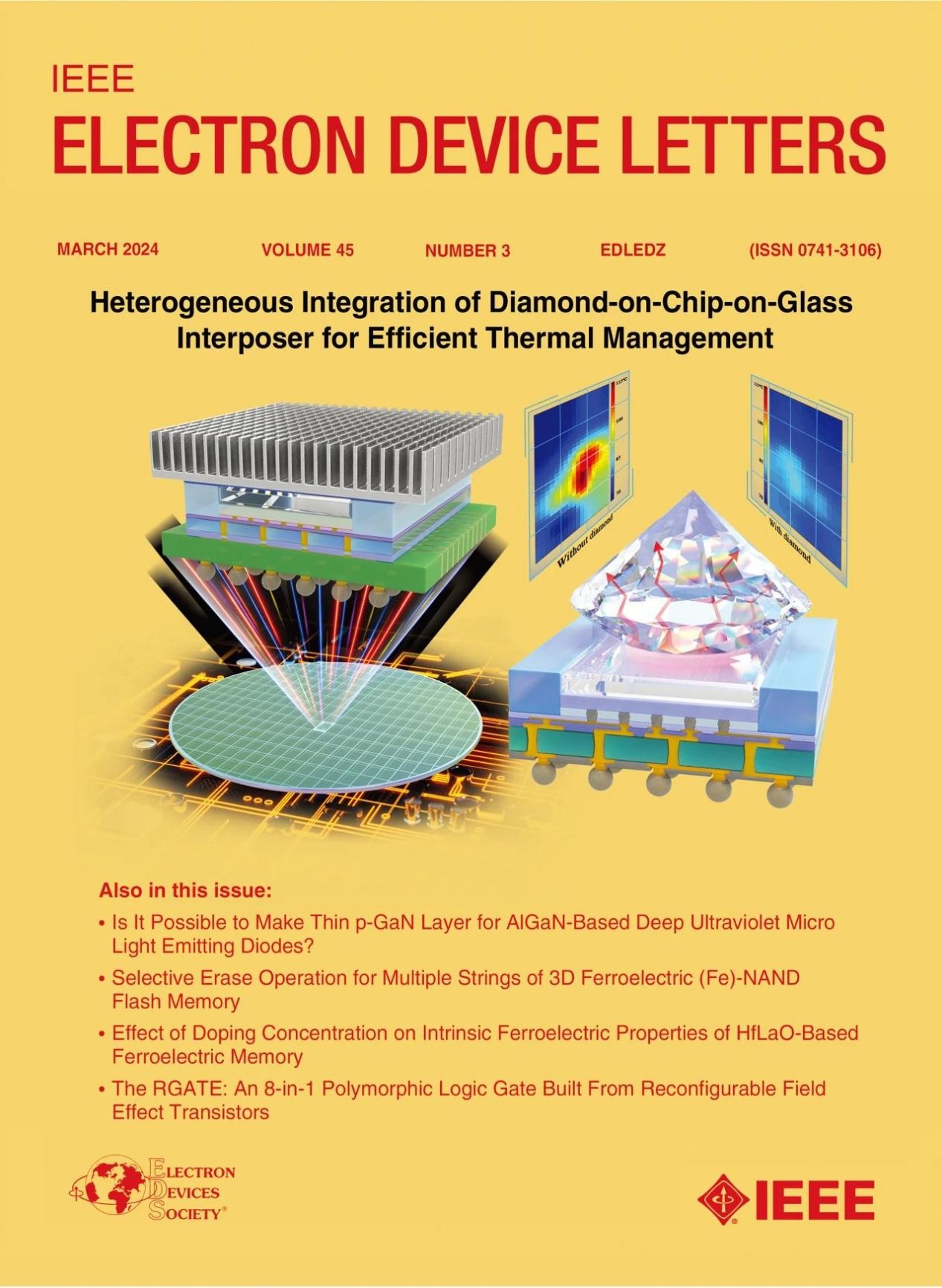該成果以“Heterogeneous Integration of Diamond-on-Chip-on-Glass Interposer for Efficient Thermal Management”為題發(fā)表在微電子器件封裝制造領(lǐng)域的國(guó)際權(quán)威期刊IEEE Electron Device Letters上,并被選為當(dāng)期封面文章(Front cover)及編輯精選文章(Editors’ Picks)。