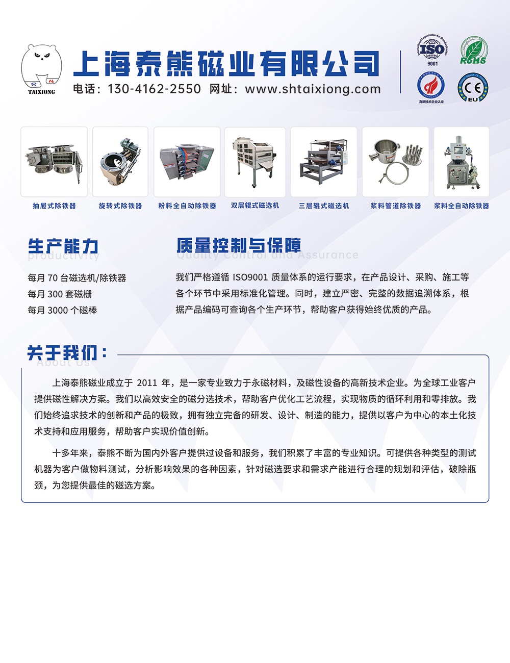 上海泰熊磁業(yè)有限公司是專(zhuān)業(yè)從事磁性材料的研發(fā)、生產(chǎn)、加工、銷(xiāo)售為一體的生產(chǎn)型企業(yè)。經(jīng)過(guò)多年的市場(chǎng)歷練,泰熊已經(jīng)在磁性事業(yè)上踏上了新的征程。公司產(chǎn)品跨四大領(lǐng)域十四大系列,從橡膠磁材到受磁材料,逐步擴(kuò)展到磁性廣告材料、磁性制品等領(lǐng)域,從片狀膠磁、卷狀膠磁系列到磁性漆、電梯磁、磁性廣告、冰箱貼磁等系列。 公司通過(guò)不斷的引進(jìn)專(zhuān)業(yè)人才和先進(jìn)技術(shù) ,與國(guó)內(nèi)外朋友廣泛合作,共同研制、開(kāi)發(fā)生產(chǎn),滿(mǎn)足廣大用戶(hù)的需求。產(chǎn)品已經(jīng)深受?chē)?guó)內(nèi)外市場(chǎng)客戶(hù)的青睞。在客戶(hù)中樹(shù)立了良好的口碑形象。