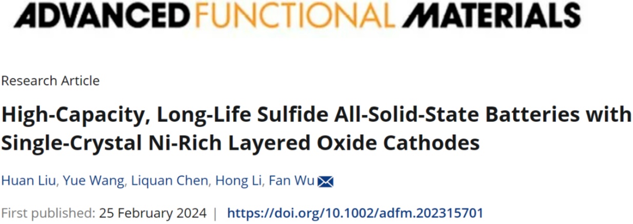 該成果以“High-Capacity, Long-Life sulfide all-solid-state batteries with single-crystal Ni-rich layered oxide cathodes”為題發(fā)表在Advanced Functional Materials上,通訊作者為中國科學(xué)院物理研究所博士生導(dǎo)師吳凡,第一作者為中國科學(xué)技術(shù)大學(xué)碩士研究生劉歡。