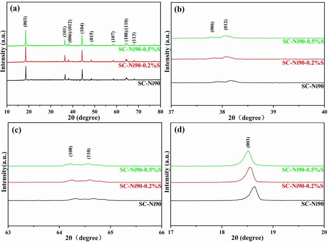圖1a顯示了SC-Ni90和SC-Ni90-S樣品的X射線衍射(XRD)圖。三個(gè)樣品的主衍射峰在XRD圖譜中很明顯,明確歸屬于六方層狀α-NaFeO2結(jié)構(gòu)和R-3m空間群(JCPDS No.70–4314),表明涂層工藝對SC-Ni90-S粉末的體相晶體結(jié)構(gòu)沒有造成破壞。圖1b和1c中(006)/(012)和(108)/(110)峰的明顯分裂證實(shí)了SC-Ni90-S有序排列的層狀結(jié)構(gòu)。此外,基于XRD圖譜計(jì)算的三種材料的所有c/a值均高于4.9(表S1),再次證實(shí)了有序的層狀結(jié)構(gòu)。然而,如圖1d所示,隨著硫化物涂層量的增加,特征峰(003)向較低的角度移動,這可能是由于燒結(jié)過程中少量硫擴(kuò)散到表面晶格。這導(dǎo)致晶格輕微膨脹,因?yàn)镾2-(1.70 Å)的離子半徑比O2-(1.26 Å)大。