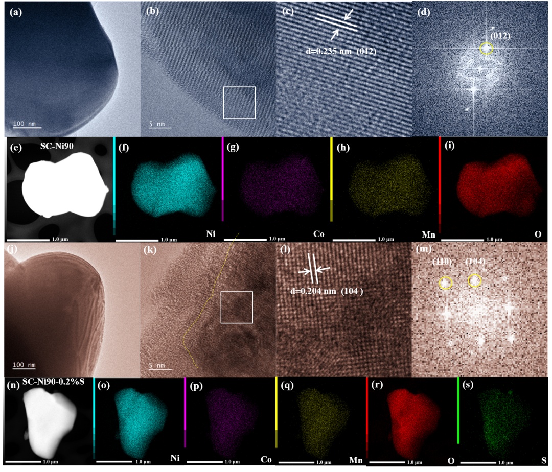 圖2.(a)SC-Ni90顆粒的TEM圖像。(b、c)SC-Ni90的表面區(qū)域的HRTEM圖像。(d)SC-Ni90的FFT圖像。(e-i)SC-Ni90顆粒的STEM暗場圖像和EDS圖像。(j)SC-Ni90-0.2%S的TEM圖像。(k,l)SC-Ni90-0.2%S的表面晶格結(jié)構(gòu)。(m)SC-Ni90-0.2%S的FFT圖像。(n-s)SC-Ni90-0.2%S顆粒的STEM暗場圖像和EDS圖像。
