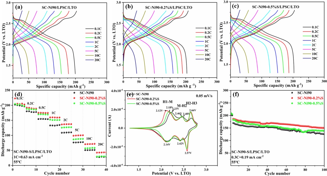 為了研究硫化涂層對SC-Ni90在硫化物ASSBs中電化學(xué)性能的影響,進(jìn)行了一系列電化學(xué)測試。圖3a-c分別顯示了三個(gè)正極在0.1 c至20 c的不同速率下的充電和放電曲線(均選自第3、第8、第13、第18、第23、第28、第33和第38次循環(huán))。當(dāng)在0.1 C的低倍率下時(shí),三個(gè)正極之間的放電容量的差異并不明顯。然而,隨著電流密度的增加,這種差異變得越來越明顯。例如,SC-Ni90、SC-Ni90-0.2%S和SC-Ni90-0.5%S在第23次循環(huán)(2C)的放電容量分別為109.5、137.2和126.8 mAh g−1。SC-Ni90、SC-Ni90-0.2%S和SC-Ni90-0.5%S在第33次循環(huán)(10 C)的放電容量分別為51.2、71.3和57.7 mAh g−1。SC-Ni90在高電流密度下較低的放電容量歸因于硫化物SE和氧化物正極之間的界面副反應(yīng)引起的高界面電阻。一方面,由于硫化物SE在正極電勢范圍內(nèi)的熱力學(xué)不穩(wěn)定狀態(tài),硫化物SE和氧化物正極之間的直接接觸導(dǎo)致缺鋰空間電荷層的形成。另一方面,由于硫化物SE和氧化物正極之間的直接接觸,硫化物固體電解質(zhì)(S和P)中擴(kuò)散的過渡金屬離子可能引發(fā)硫化物和氧化物離子之間的二次反應(yīng),也形成不希望的反應(yīng)層。然而,硫化物涂層策略不僅抑制了硫化物SE和氧化物正極之間的不良反應(yīng),而且有效緩解了空間電荷層效應(yīng)。同時(shí),涂層提供了一種改進(jìn)的離子轉(zhuǎn)移通道,可以加速Li離子的擴(kuò)散并促進(jìn)反應(yīng)動力學(xué)。因此,在極高的電流密度下,SC-Ni90-0.2%S的容量顯著高于其他正極的容量。圖3d顯示了三種正極的速率-性能圖,其遵循以下定律:SC-Ni90-0.2%S>SC-Ni90-0.5%S>SC-Ni90。這再次表明涂層的適當(dāng)厚度有利于改善SC-Ni90的倍率性能。SC-Ni90/LPSC/LTO和SC-Ni90-S/LPSC/LTO電池在1.3 V和2.8 V(vs. LTO)之間以0.05 mV S–1的掃描速率的循環(huán)伏安法(CV)。結(jié)果如圖3e所示,可以觀察到每條曲線的三個(gè)陽極峰和相應(yīng)的陰極峰。CV曲線顯示,與SC-Ni90相比,SC-Ni90-0.2%S的陽極峰(對應(yīng)于2.12V(vs. LTO)下的H1-M相變)移動到較低的電壓。該偏移表面在初始充電階段期間極化的減少和H1-M相變的改善。這種現(xiàn)象可歸因于SC-Ni90-0.2%S的鋰擴(kuò)散系數(shù)升高(如圖6所示)。在0.3 C下進(jìn)一步評估了這三種材料的循環(huán)性能(圖3f)。如圖3f所示,在兩次循環(huán)活化后,原始樣品的放電容量約為170 mAh g−1,而SC-Ni90-0.2%S和SC-Ni90-0.5%S的放電容量顯著增加至約187 mAh g–1和183 mAh g-1。值得注意的是,在100次循環(huán)后,SC-Ni90-0.2%S 全固態(tài)電池具有最小的容量衰減,表明在電化學(xué)過程中SC-Ni90-0.2%S和LPSC之間的界面穩(wěn)定性得到了改善。這種效應(yīng)可歸因于表面涂層穩(wěn)定的正極和硫化物界面。