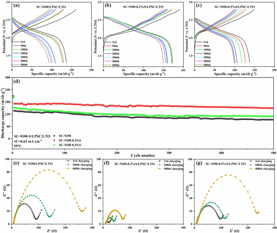 圖4.(a-c)不同循環(huán)下硫化物ASSB中SC-Ni90和SC-Ni90-S的充電/放電曲線。(d)SC-Ni90和SC-Ni90-S在硫化物ASSB中在1 C下的長循環(huán)性能。(e-g)在不同循環(huán)次數(shù)下硫化物ASSB的SC-Ni90與SC-Ni90-S的奈奎斯特圖。