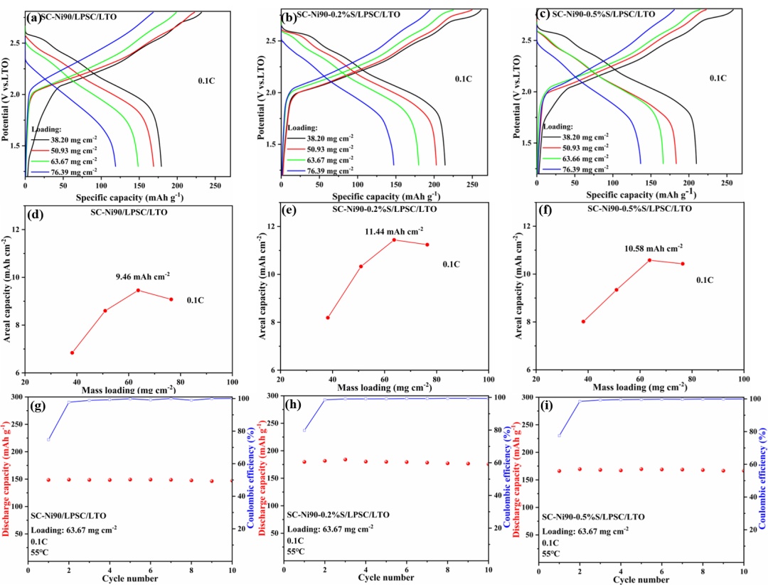 圖5.(a-c)硫化物ASSB中SC-Ni90和SC-Ni90-S在不同質(zhì)量負(fù)載下的充電/放電曲線。(d-f)面容量與質(zhì)量負(fù)載的關(guān)系。(g-i)SC-Ni90和SC-Ni90-S的放電容量。