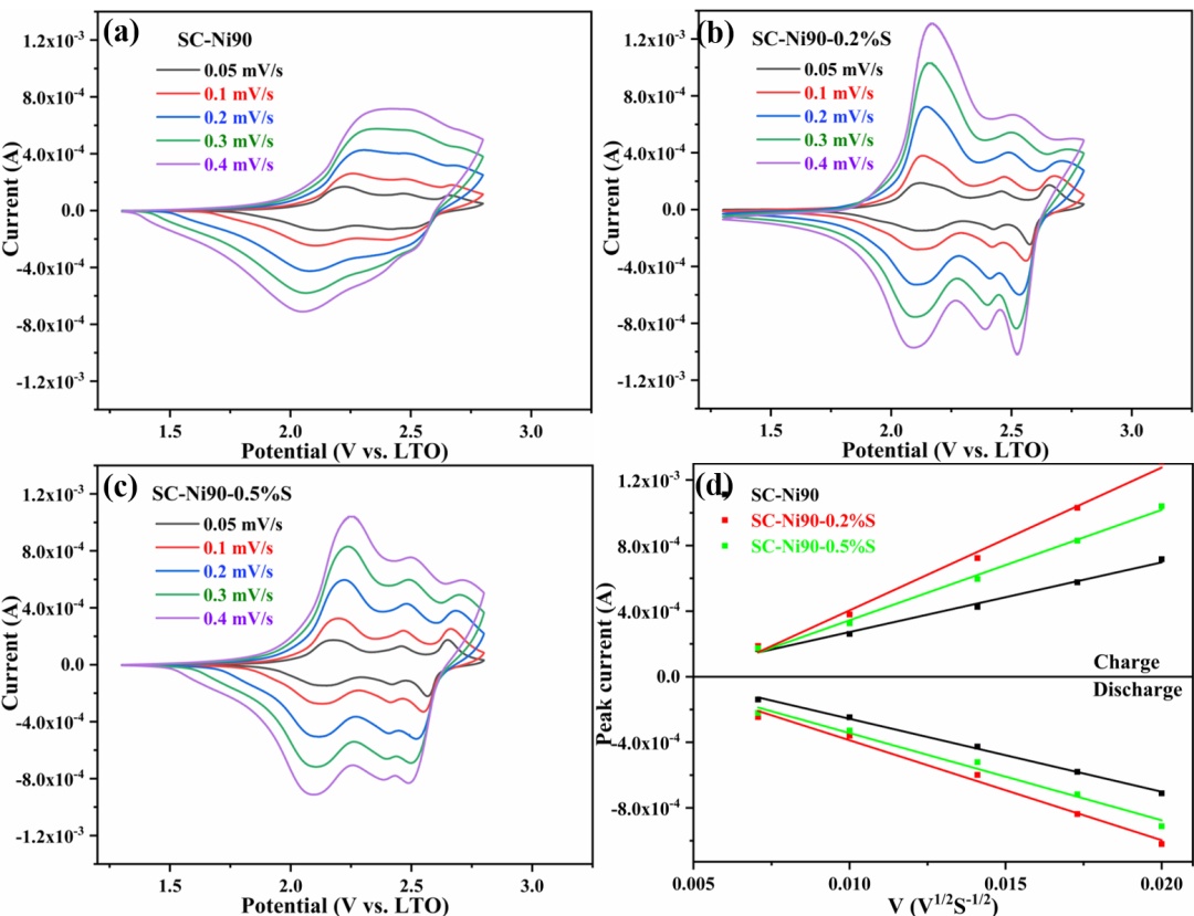 圖6a-c示出了在不同掃描速率下的CV測試,以解釋不同正極的倍率性能和長循環(huán)性能的差異。可以看出,氧化還原峰的峰值電流隨著掃描速率的增加而連續(xù)增加,并且氧化/還原峰的位置逐漸向較高/較低的電勢移動,這與極化電壓隨著電流密度的增加而增加的現(xiàn)象一致。從曲線中可以明顯看出,SC-Ni90-0.2%S在0.05至0.4 mV/S的不同掃描速率下產(chǎn)生最小的相變(H1-M)電勢差,從而指示小極化。通過改變掃描速率可以獲得不同的峰值電流,擴(kuò)散系數(shù)可以通過Randles-Sevcik方程獲得:
