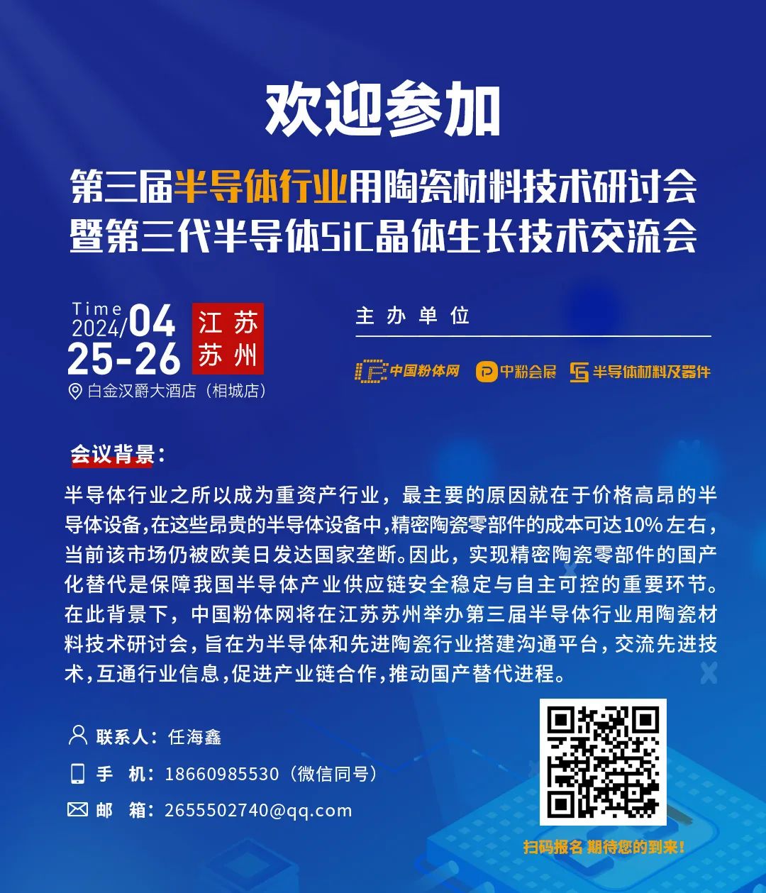第三屆半導(dǎo)體行業(yè)用陶瓷材料技術(shù)研討會將于 2024年4月25-26日在蘇州舉辦。西安稀有金屬材料研究院有限公司邀請您共同出席。