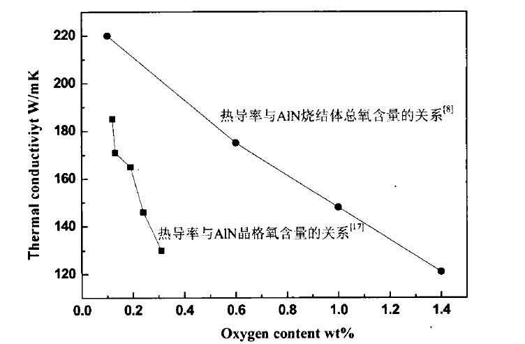 AlN陶瓷熱導(dǎo)率與氧含量的關(guān)系圖