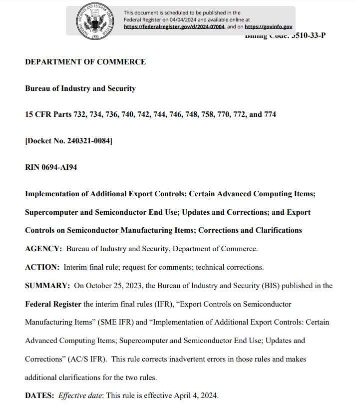 中國粉體網(wǎng)訊 剛剛美國商務(wù)部工業(yè)和安全局(BIS)對此前實施的半導(dǎo)體出口管制規(guī)則進行再次修訂升級,旨在加大中國進口美國先進人工智能芯片的難度!新修訂的規(guī)則將于4月4日生效。