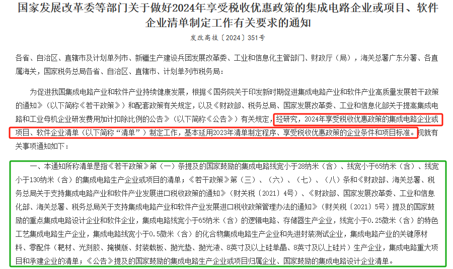 2024年3月22日,國家發(fā)展改革委等5部門聯(lián)合發(fā)布新政策,用真金白銀支持半導(dǎo)體企業(yè)發(fā)展!國家發(fā)展改革委等部門發(fā)布《關(guān)于做好2024年享受稅收優(yōu)惠政策的集成電路企業(yè)或項目、軟件企業(yè)清單》。