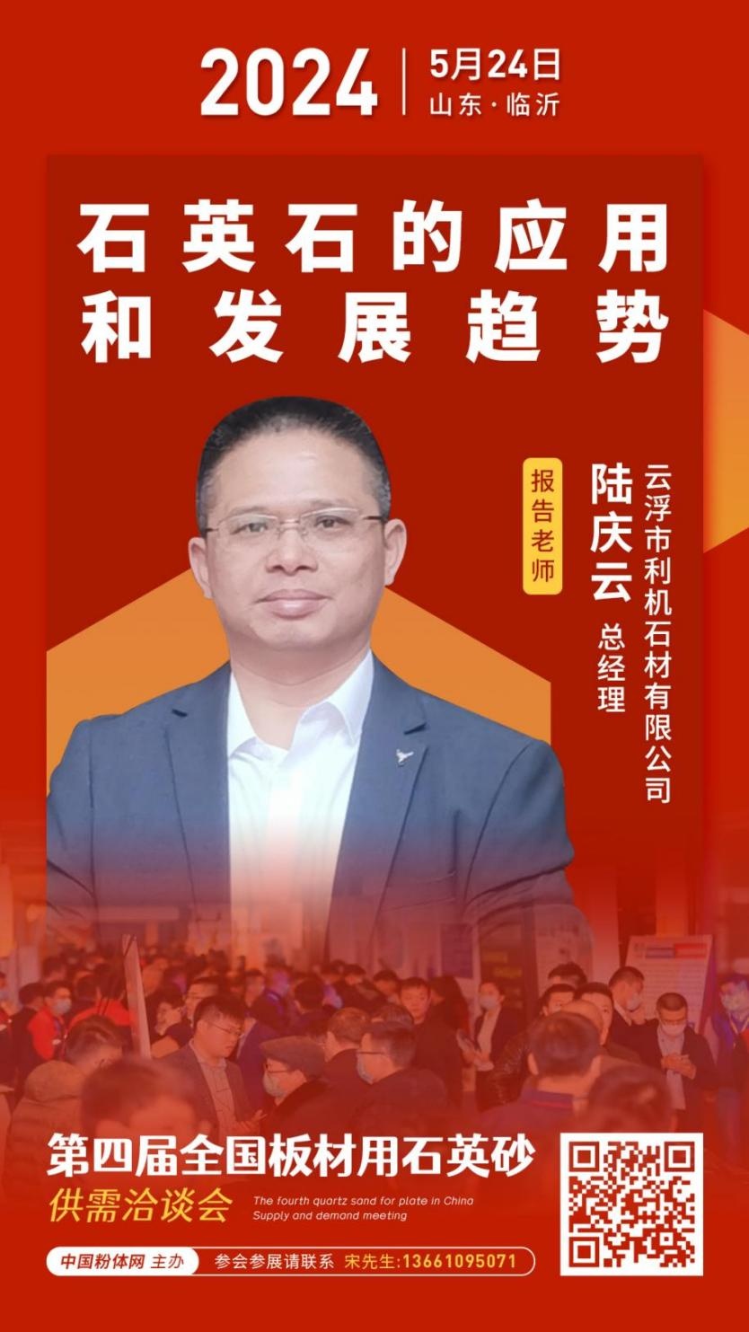 2024年5月24日,由中國粉體網(wǎng)主辦的第四屆全國板材用石英砂供需洽談會(huì)即將在山東臨沂召開,云浮市利機(jī)石材有限公司總經(jīng)理陸慶云將做《石英石的應(yīng)用和發(fā)展趨勢》的報(bào)告,屆時(shí),他將對石英石的應(yīng)用和發(fā)展趨勢進(jìn)行詳細(xì)解讀。