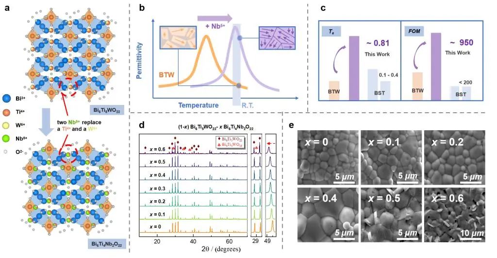 圖1.(1-x)Bi6Ti5WO22 -xBi6Ti4Nb2O22陶瓷的離子取代的設(shè)計思路與最終制備效果
