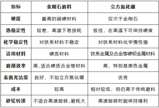 在選擇金剛石磨料和立方氮化硼磨料時,需要考慮工件的材料類型、硬度、是否含有鐵系元素以及砂輪的預(yù)期使用轉(zhuǎn)速等多種因素。金剛石磨料通常適用于非鐵系材料,如硬質(zhì)合金、玻璃、陶瓷等,而立方氮化硼磨料特別適合鐵系金屬材料的加工,如工具鋼和高速鋼。此外,對于表面光潔度的要求程度以及成本,也是選擇磨料的重要考量因素。金剛石磨料與立方氮化硼磨料的部分指標(biāo)對比如下: