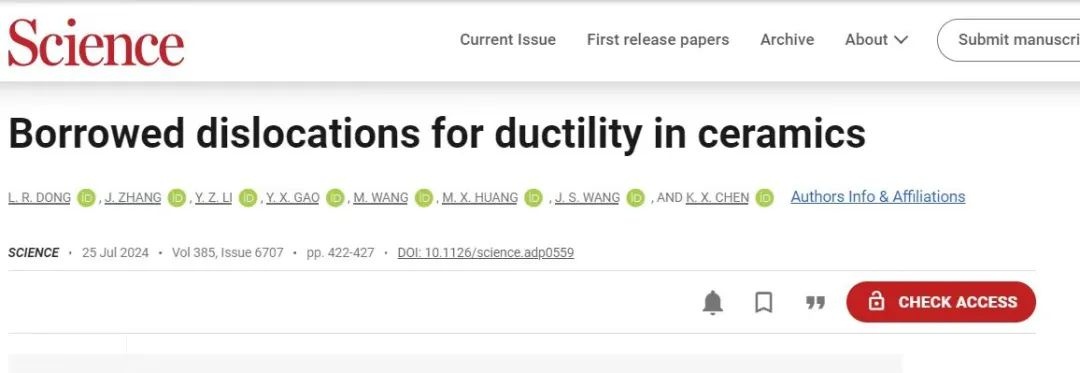7月26日,國(guó)際高水平期刊《Science》刊發(fā)了北京工業(yè)大學(xué)材料科學(xué)與工程學(xué)院王金淑教授科研團(tuán)隊(duì)聯(lián)合北京科技大學(xué)陳克新教授以及香港大學(xué)黃明欣教授研發(fā)的科研成果《Borrowed dislocations for ductility in ceramics》。該項(xiàng)研究成果為世界上首次實(shí)現(xiàn)陶瓷的室溫拉伸塑性,陶瓷拉伸延伸率可達(dá)39.9%,強(qiáng)度約為2.3 GPa。這是北京工業(yè)大學(xué)又一篇以第一作者單位在《Science》期刊上發(fā)表的論文,標(biāo)志著學(xué)校在材料領(lǐng)域取得重要科研進(jìn)展。