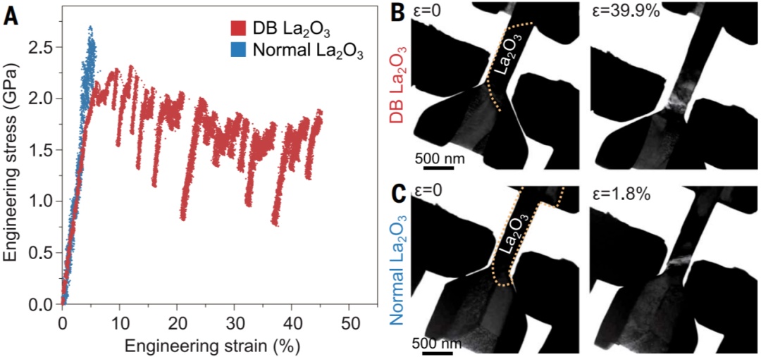 與金屬M(fèi)o具有有序界面結(jié)構(gòu)的La2O3陶瓷可成功從金屬中“借位錯(cuò)”,從而首次展示出高達(dá)39.9%的室溫拉伸變形