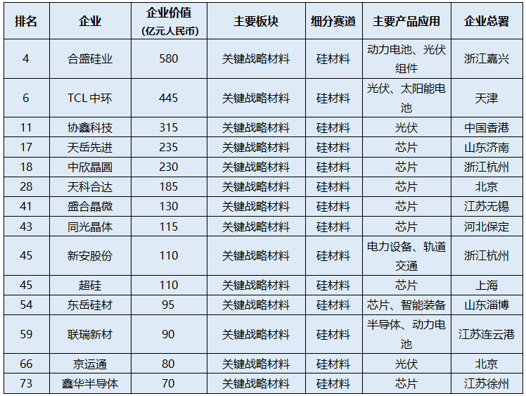 本次上榜的企業(yè)中,從行業(yè)布局來(lái)看,“關(guān)鍵戰(zhàn)略材料”企業(yè)數(shù)量最多,硅材料細(xì)分賽道涉及企業(yè)10余家。