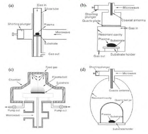 圖2不同幾何形狀的 MPCVD 裝置。(a)石英管式 MPCVD 裝置,(b)圓柱金屬諧振腔式MPCVD 裝置,(c)多模非圓柱諧振腔式 MPCVD 裝置,(d)橢球諧振腔式 MPCVD 裝置。