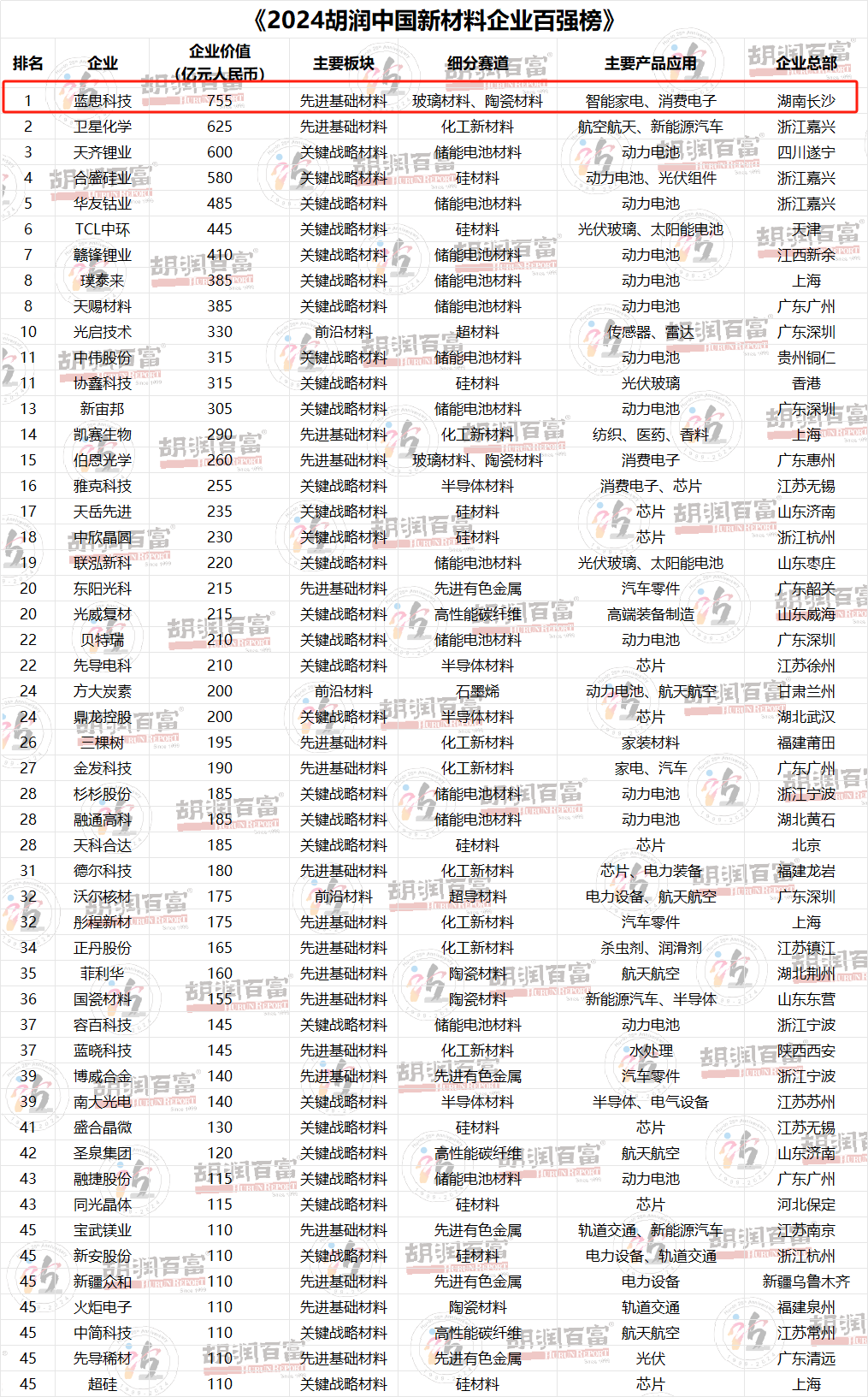 中國粉體網(wǎng)訊 近日,胡潤研究院在2024世界新能源新材料大會上發(fā)布了《2024胡潤中國新材料企業(yè)百強榜》,《新材料百強榜》列出了中國新材料領(lǐng)域最具價值的企業(yè)(非國有企業(yè)),主營玻璃/陶瓷材料的藍思科技位列第一,國瓷材料、火炬電子等多家陶瓷企業(yè)榜上有名。