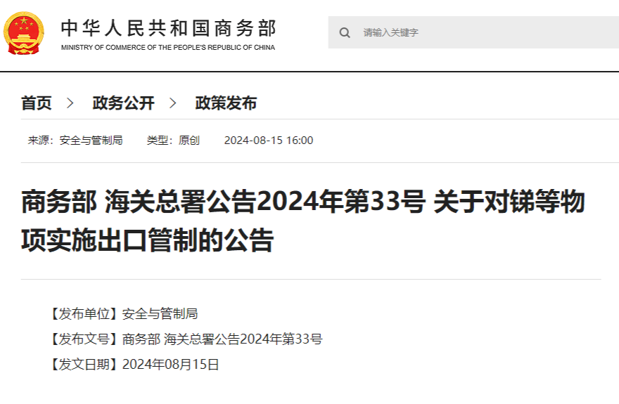 中國粉體網(wǎng)訊 8月15日,商務(wù)部、海關(guān)總署發(fā)布公告稱,為維護(hù)國家安全和利益、履行防擴散等國際義務(wù),經(jīng)國務(wù)院批準(zhǔn),決定對銻、超硬材料相關(guān)物項實施出口管制。