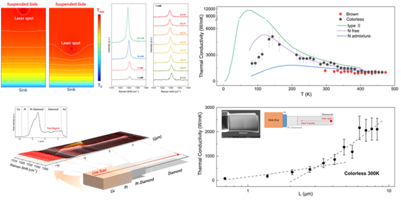 該研究探討了納米尺度下,單晶金剛石中的熱輸運(yùn)現(xiàn)象,提供了超薄結(jié)構(gòu)中二維聲子輸運(yùn)模式的新見(jiàn)解。研究團(tuán)隊(duì)將單晶金剛石減薄到幾十納米數(shù)量級(jí),并通過(guò)拉曼光譜監(jiān)測(cè)聲子能量變化。