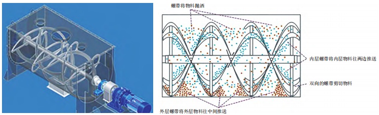 臥式螺帶混合機的混合原理是強制剪切攪拌型混合,主要由混合倉、攪拌器、驅動裝置三個基本部分構成,工作時,外螺旋帶在動力的驅動下,把物料從U型倉兩端向中央地帶推動,內螺旋帶把物料從中間向兩端推動,從而形成對流混合;旌蠙C出料口設置在混合機筒體底部中央,外層螺旋帶的蝸旋結構與主軸旋轉方向配合,將筒壁內側的物料驅趕至中央出料口處出料,從而確保筒體內物料出料完全。