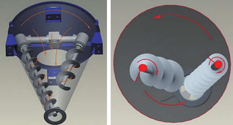 雙螺旋錐形混合設備能夠形成4種方向的作用力: