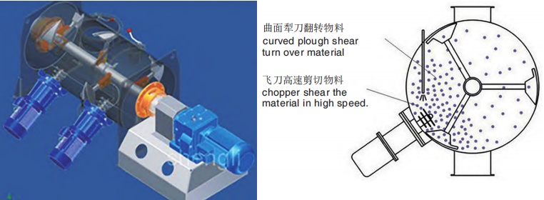 犁刀式混合機通常采用單軸式攪拌結構,主軸上連續(xù)錯位安裝多組犁刀式攪拌器,此結構可保證運轉時,產生不間斷式的漩渦離心作用力,最大程度上避免攪拌死角。設備工作時,結團性物料通過在犁刀混料機內安裝的高速飛刀,結合犁刀攪拌器攪拌物料時形成的對流循環(huán)作用,對物料進行打散、分離。高速飛刀通常安裝于犁刀混料機筒,在攪拌時,物料受犁刀驅趕至飛刀有效范圍,飛刀進行高速剪切。