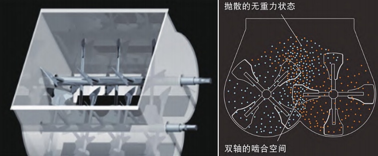無重力混合機裝載著兩根同時異向向外旋轉的平行槳葉軸,每根軸上搭載十字槳葉,在驅動裝置的同步作用下,兩根的十字槳葉軸的運行軌跡成相交關系,且錯位嚙合。驅動裝置驅使槳葉軸快速旋轉,旋轉的槳葉產生離心力,將物料有效拋灑至筒內上空部分,達到拋物線的高點后下落(拋物線的高點也稱為瞬間無重力狀態(tài)),物料再受槳葉的驅趕,在筒體內往復循環(huán)混合,并受雙軸的嚙合空間混合、剪切、分離,致使物料快速混合均勻。