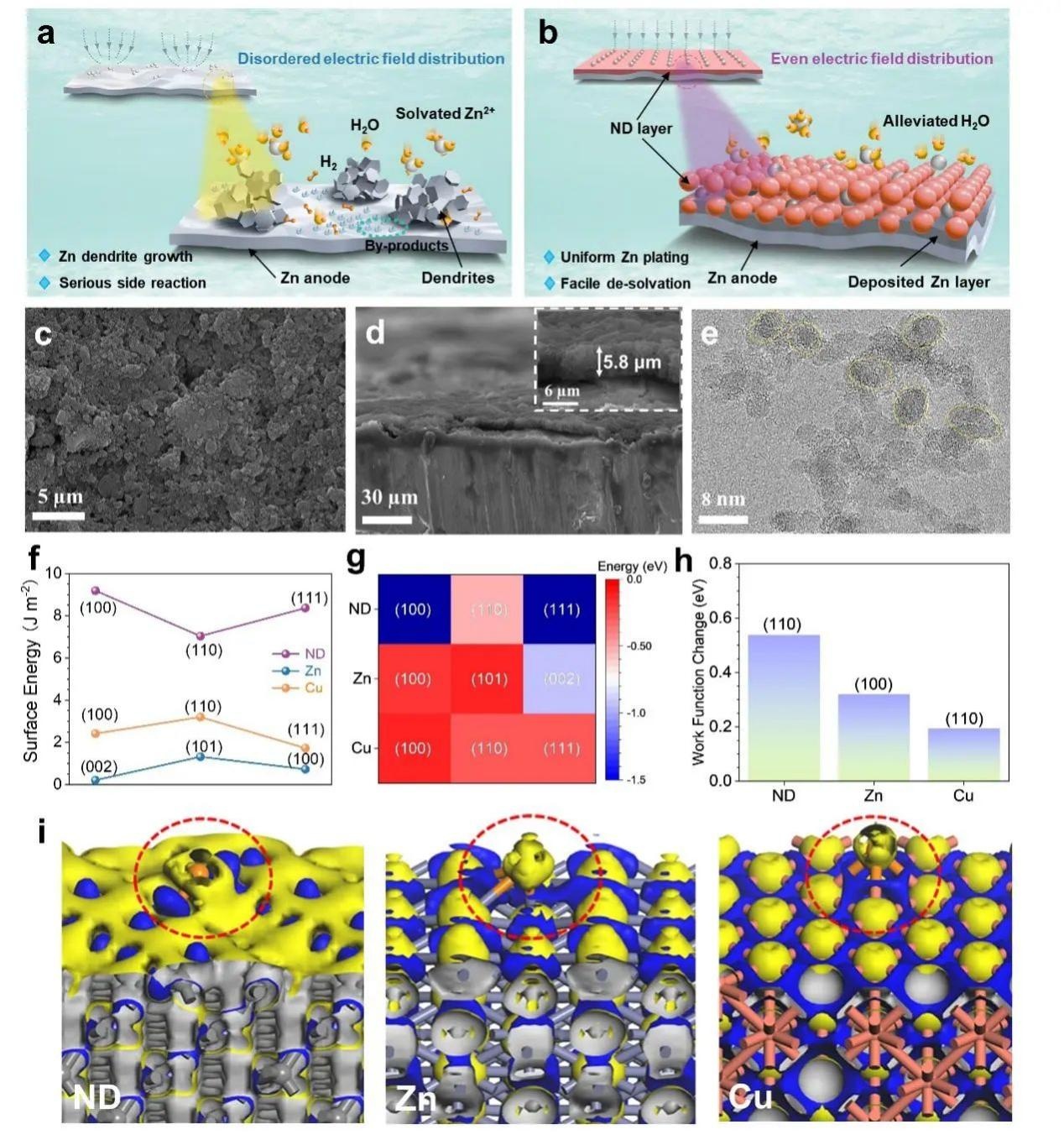 中國粉體網(wǎng)訊 近期,香港城市大學(xué)的張文軍教授和洪果教授攜手香港理工大學(xué)的黃渤龍教授共同展開合作,精心設(shè)計(jì)并成功制備出一種多功能納米金剛石保護(hù)涂層。該涂層在水系鋅離子電池中,對鋅枝晶的生長以及析氫反應(yīng)起到了顯著的抑制作用,充分展現(xiàn)出極為優(yōu)異的循環(huán)穩(wěn)定性。相關(guān)成果以“Multifunctional Nanodiamond Interfacial Layer for Ultra-Stable Zinc-Metal Anodes”為題發(fā)表在Advanced Energy Materials 期刊上。