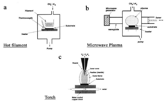 (a)熱絲CVD (b)微波等離子體CVD (c)火焰燃燒CVD