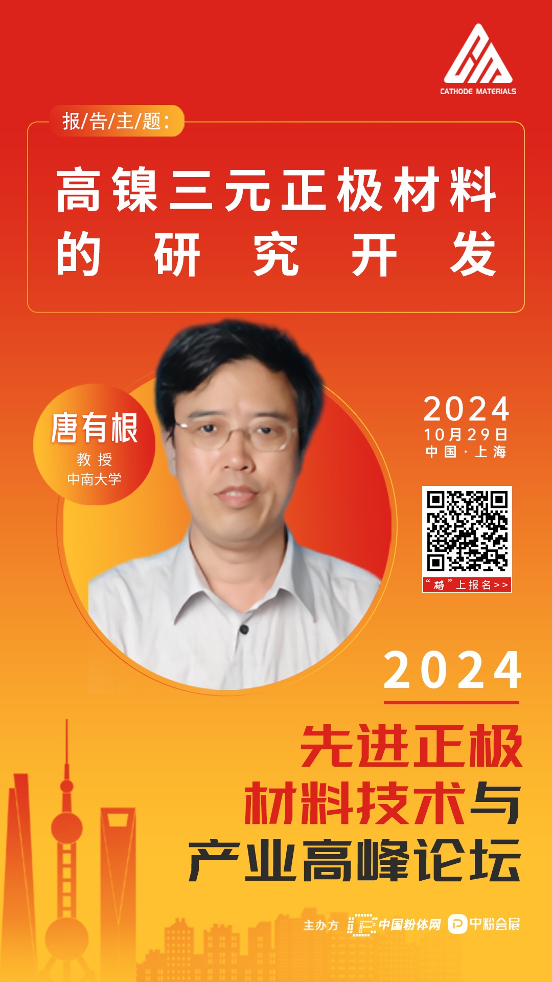 2024年10月29-31日在上?鐕少彆怪行,由北京粉體技術(shù)協(xié)會與柏德英思展覽(上海)有限公司聯(lián)合主辦2024先進(jìn)正極材料技術(shù)與產(chǎn)業(yè)高峰論壇。屆時,來自中南大學(xué)的唐有根教授將作題為《高鎳三元正極材料的研究開發(fā)》的報告。