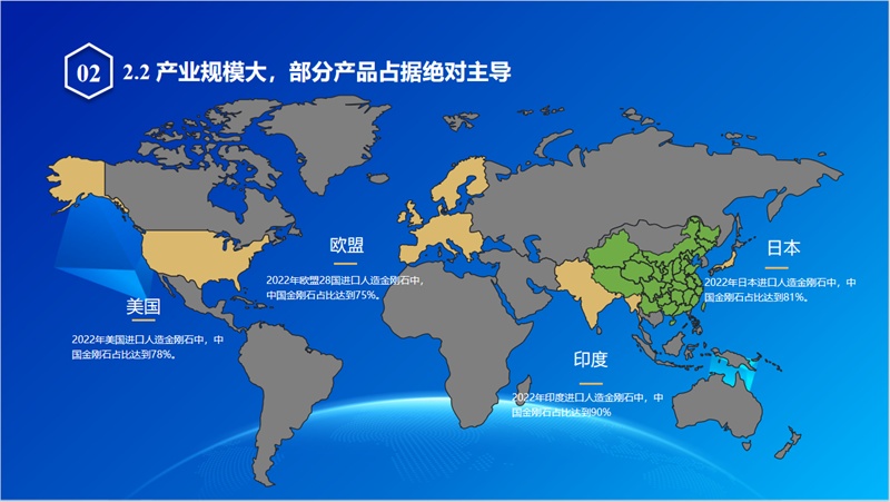 從產(chǎn)業(yè)規(guī)模來看,中國人造金剛石單晶產(chǎn)量占全球的95%。2022年美國進(jìn)口人造金剛石中,中國金剛石占比達(dá)到78%;歐盟28國進(jìn)口人造金剛石中,中國金剛石占比達(dá)到75%;印度進(jìn)口人造金剛石中,中國金剛石占比達(dá)到90%;日本進(jìn)口人造金剛石中,中國金剛石占比達(dá)到81%。