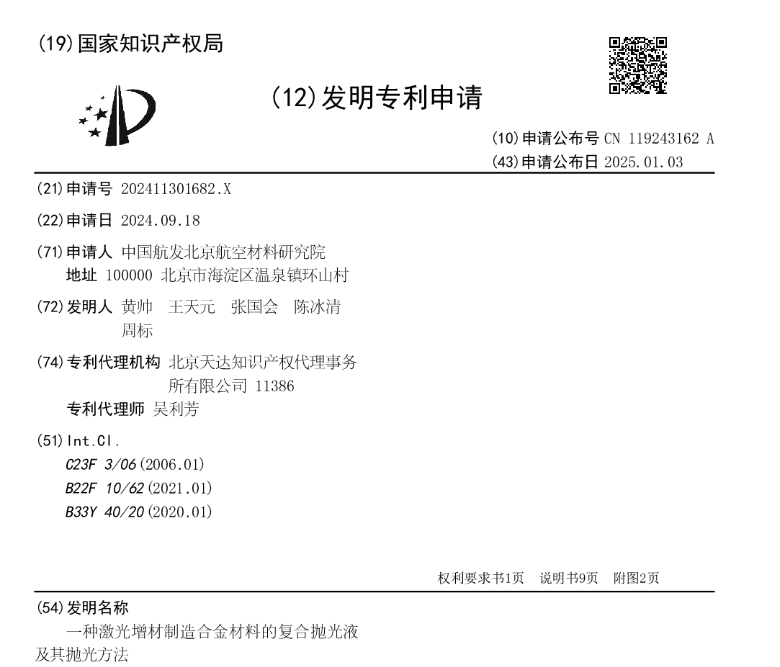 中國粉體網(wǎng)訊 2025年1月3日消息,國家知識產(chǎn)權(quán)局信息顯示,中國航發(fā)北京航空材料研究院取得一項名為“一種激光增材制造合金材料的復合拋光液及其拋光方法”的專利,提高激光增材制造合金材料的表面平整度。