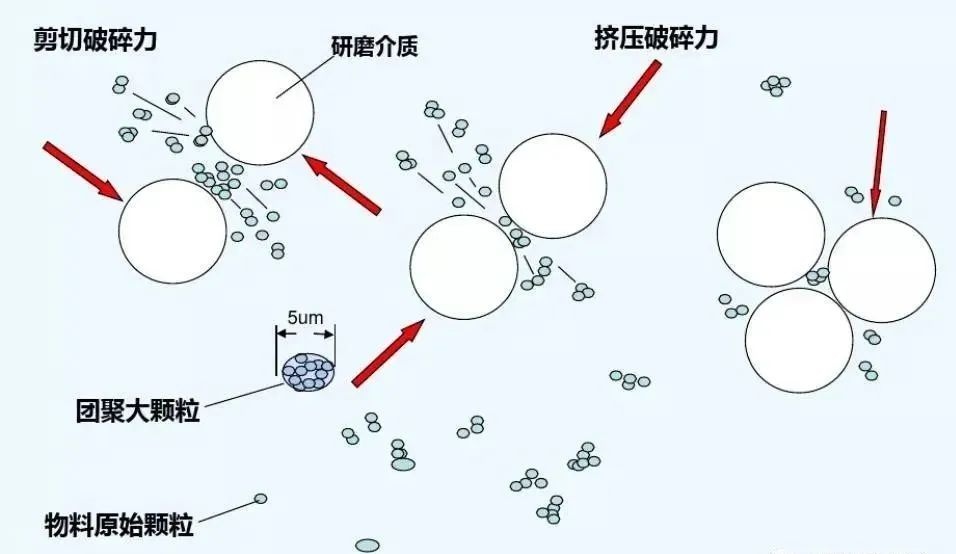 此外,粉體在粒徑細(xì)到一定程度時,會出現(xiàn)團(tuán)聚現(xiàn)象,原本細(xì)小的顆粒會聚集成團(tuán),這對實際生產(chǎn)是十分不利的,為了解決粉體團(tuán)聚問題,工業(yè)上通常采用機(jī)械方式研磨解聚,常用的研磨設(shè)備主要有臥式砂磨機(jī)、立式珠磨機(jī)和球磨機(jī)等。