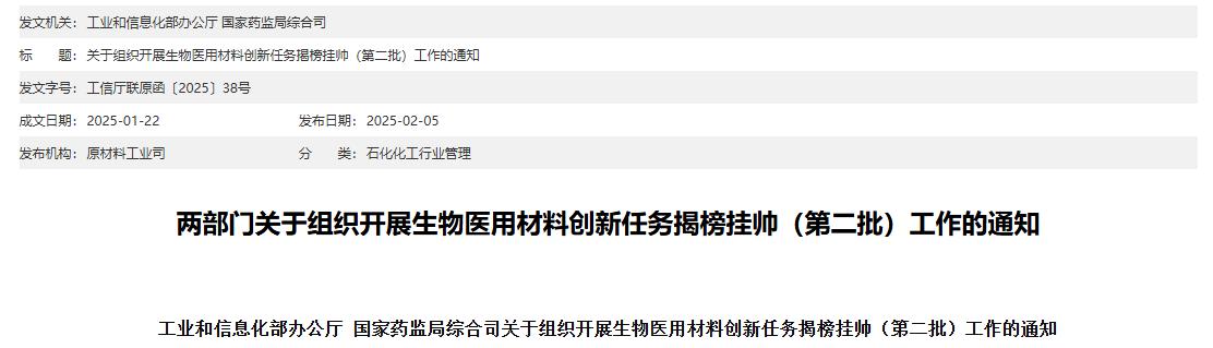 中國粉體網(wǎng)訊 2月5日,工業(yè)和信息化部辦公廳和國家藥監(jiān)局綜合司發(fā)布“關(guān)于組織開展生物醫(yī)用材料創(chuàng)新任務(wù)揭榜掛帥(第二批)工作的通知”。