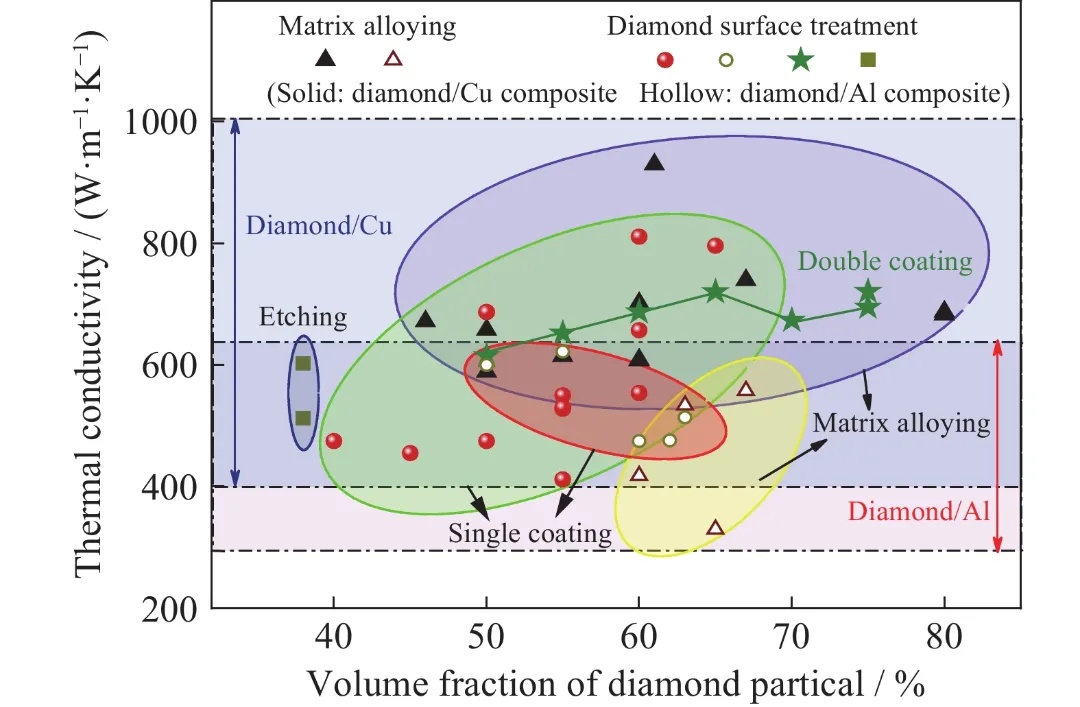 不同界面改性制備的金剛石/金屬?gòu)?fù)合材料熱導(dǎo)率圖
