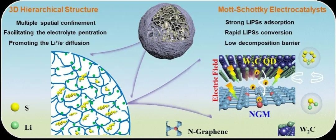 針對(duì)鋰硫電池中多硫化物穿梭和反應(yīng)動(dòng)力學(xué)緩慢等問(wèn)題,該研究團(tuán)隊(duì)設(shè)計(jì)了一種新型三維分級(jí)的莫特-肖特基電催化劑,利用碳的多重空間限域效應(yīng)抑制LiPS穿梭,莫特-肖特基電催化劑及自發(fā)的電荷重構(gòu)促進(jìn)反應(yīng)動(dòng)力學(xué)。