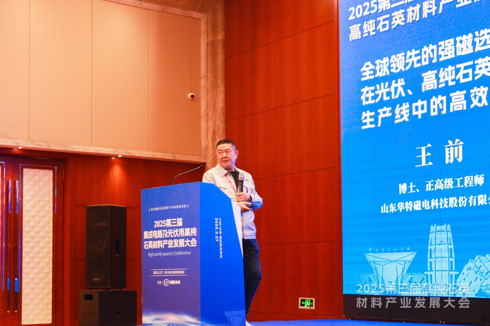 山東華特磁電科技股份有限公司營(yíng)銷(xiāo)中心副總經(jīng)理付有良(代)執(zhí)行總裁王前博士作《全球領(lǐng)先的強(qiáng)磁選裝備在光伏、高純石英提純生產(chǎn)線中的高效利用》報(bào)告