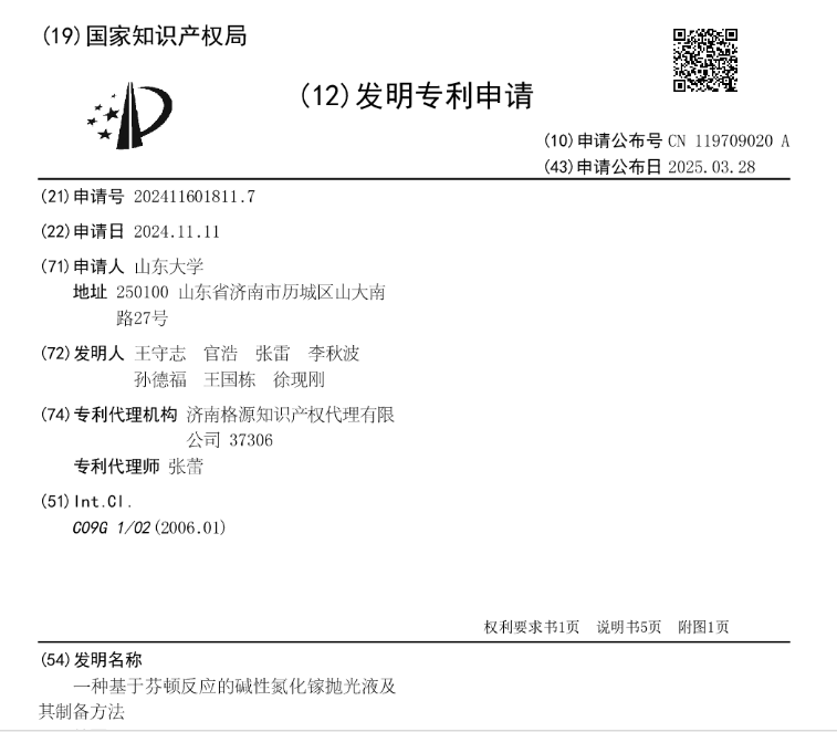中國粉體網(wǎng)訊 近日,國家知識產(chǎn)權(quán)局信息顯示,山東大學(xué)取得一項名為“一種基于芬頓反應(yīng)的堿性氮化鎵拋光液及其制備方法”的專利,能夠有效延長拋光液的有效時長。