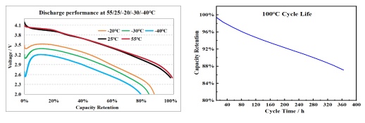 第二代固態(tài)電池同時還具備“寬溫域”的優(yōu)異特性。該固態(tài)電池可在-40℃~100℃時放電使用,-20℃放電效率>85%,-40℃放電效率>75%。同時,該固態(tài)電池還可以在100℃高溫環(huán)境下安全連續(xù)進行充、放電循環(huán),360小時后仍有88%的容量保持率,使用溫域橫跨140℃;诖颂匦裕诙虘B(tài)電池可在極寒、高溫等極端環(huán)境下平穩(wěn)使用。