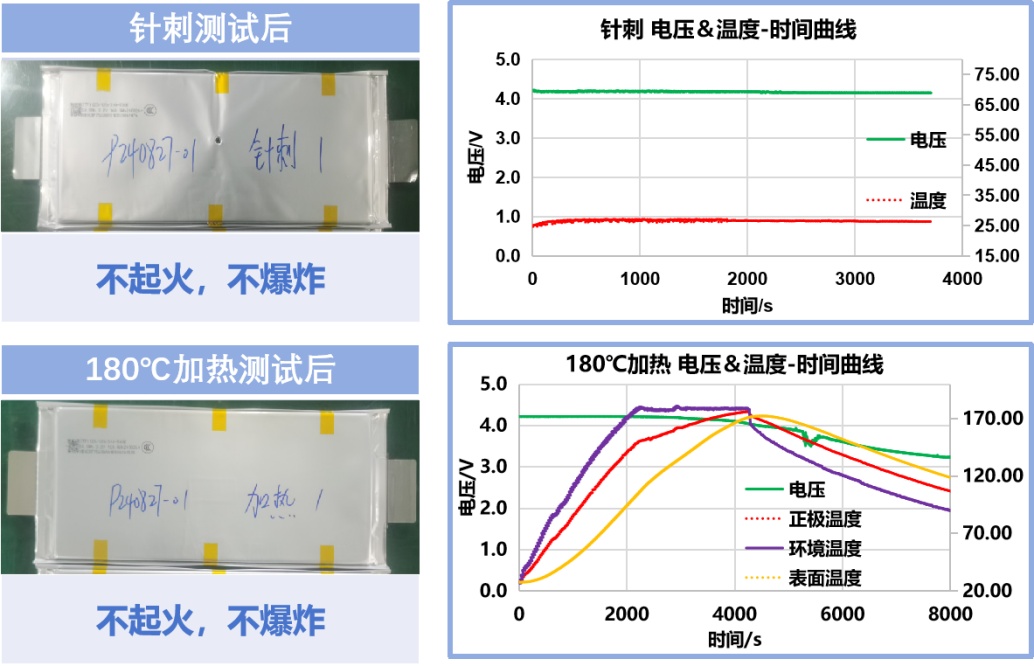 固態(tài)電池的安全突破不僅是技術改良,更是讓“絕對安全”變?yōu)榭赡。公司第二代固態(tài)電池安全性能滿足GB 38031-2020要求,并成功通過過充(1C充至10V)、過放(1C放電90min)、針刺和180°C熱箱測試等苛刻條件下的安全測試,未出現起火、爆炸現象,打造出真正安全的固態(tài)電池。